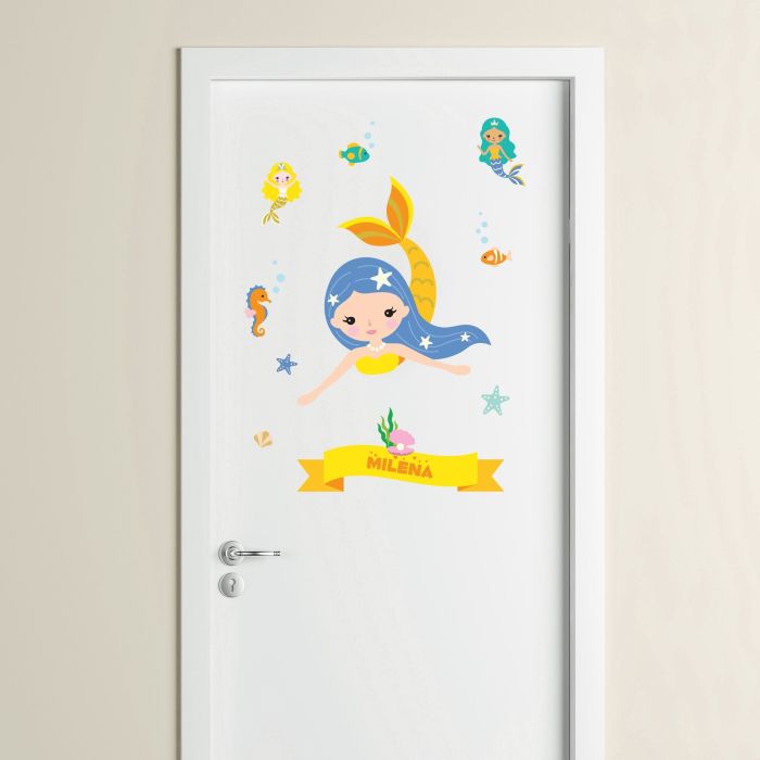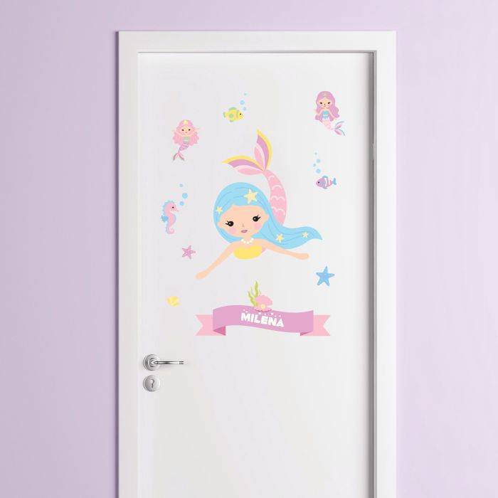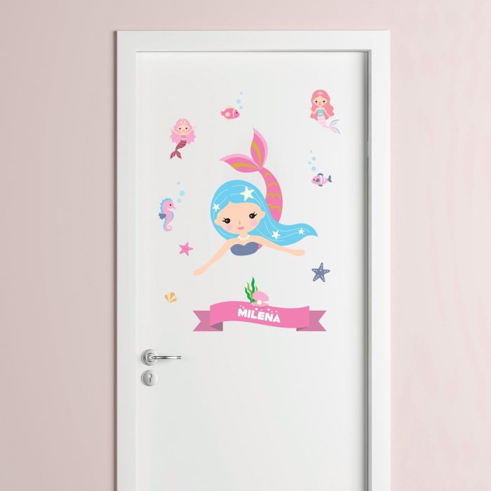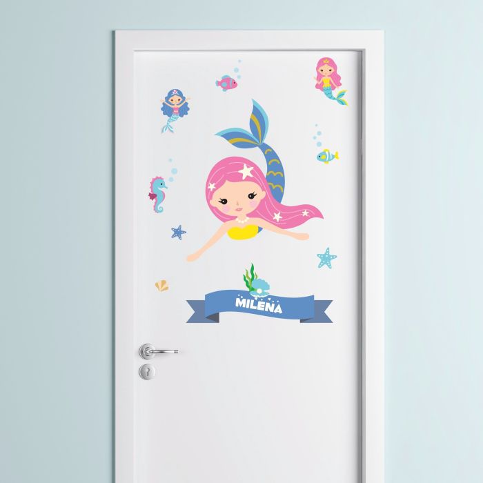 The mermaid door sticker set consists of 1x large mermaid, 2x small mermaid, 2x fish, 1x seahorse, 2x starfish, 1x mussels, 4x bubbles, 1x personalizable name banner.