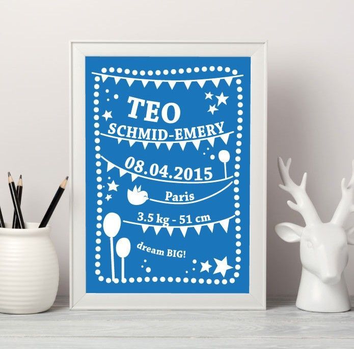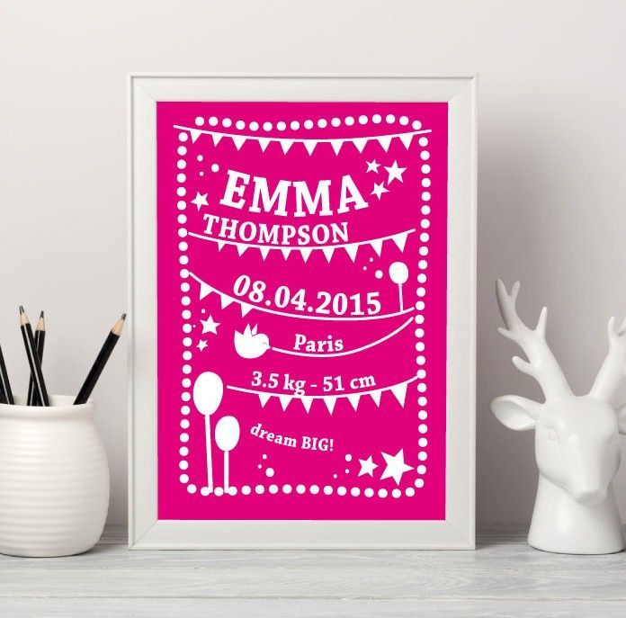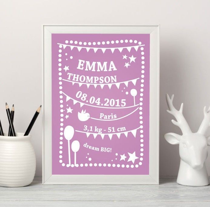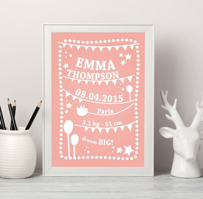 The final and cutest touch for decorating the baby’s room. This design is 100% unique. Write the name of your little one, birthdate, weight and all other details you’d like to remember, maybe even a unique personal phrase or message. Choose your favorite color and get ready to receive a beautiful memory that will last a lifetime.